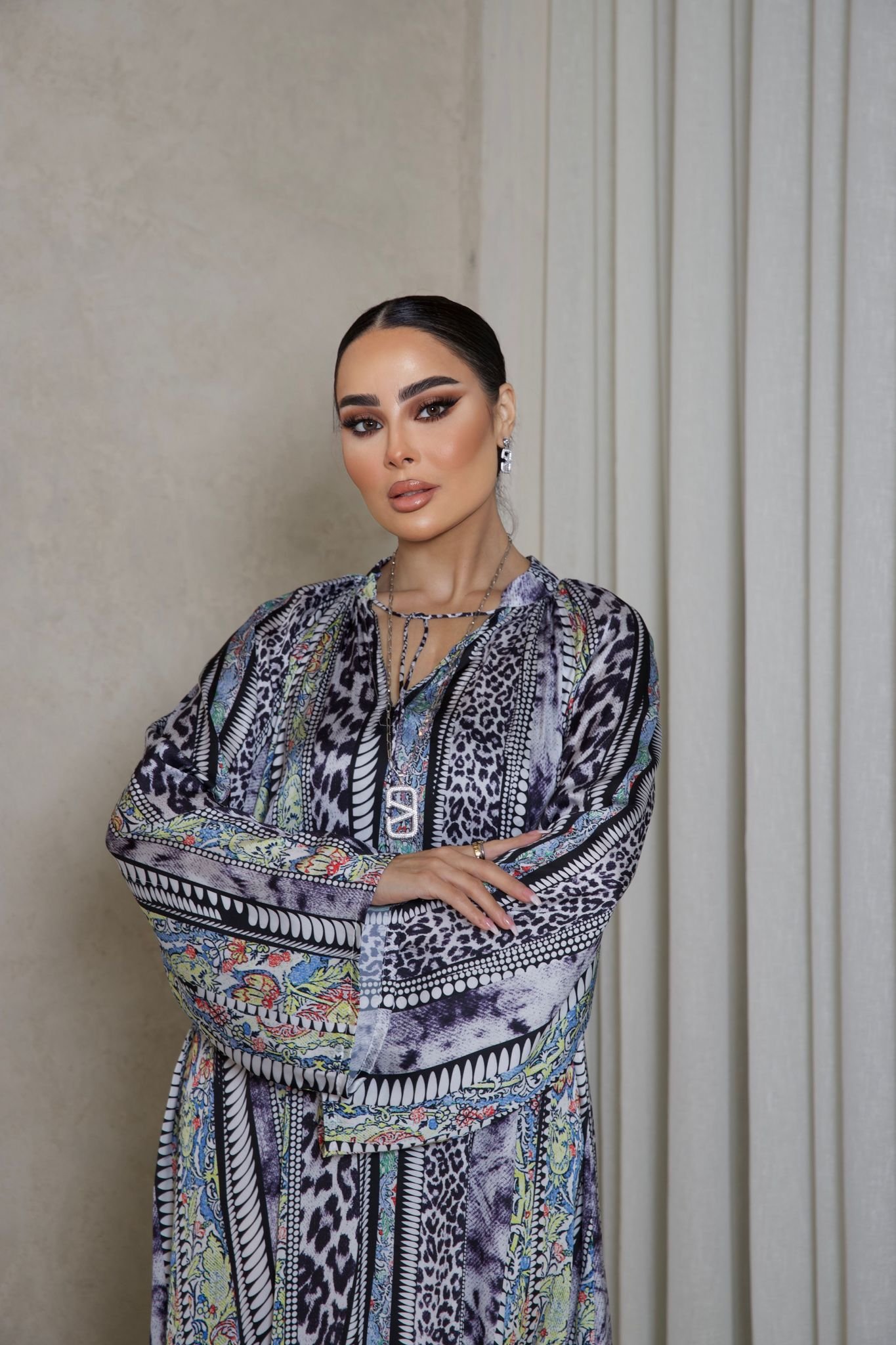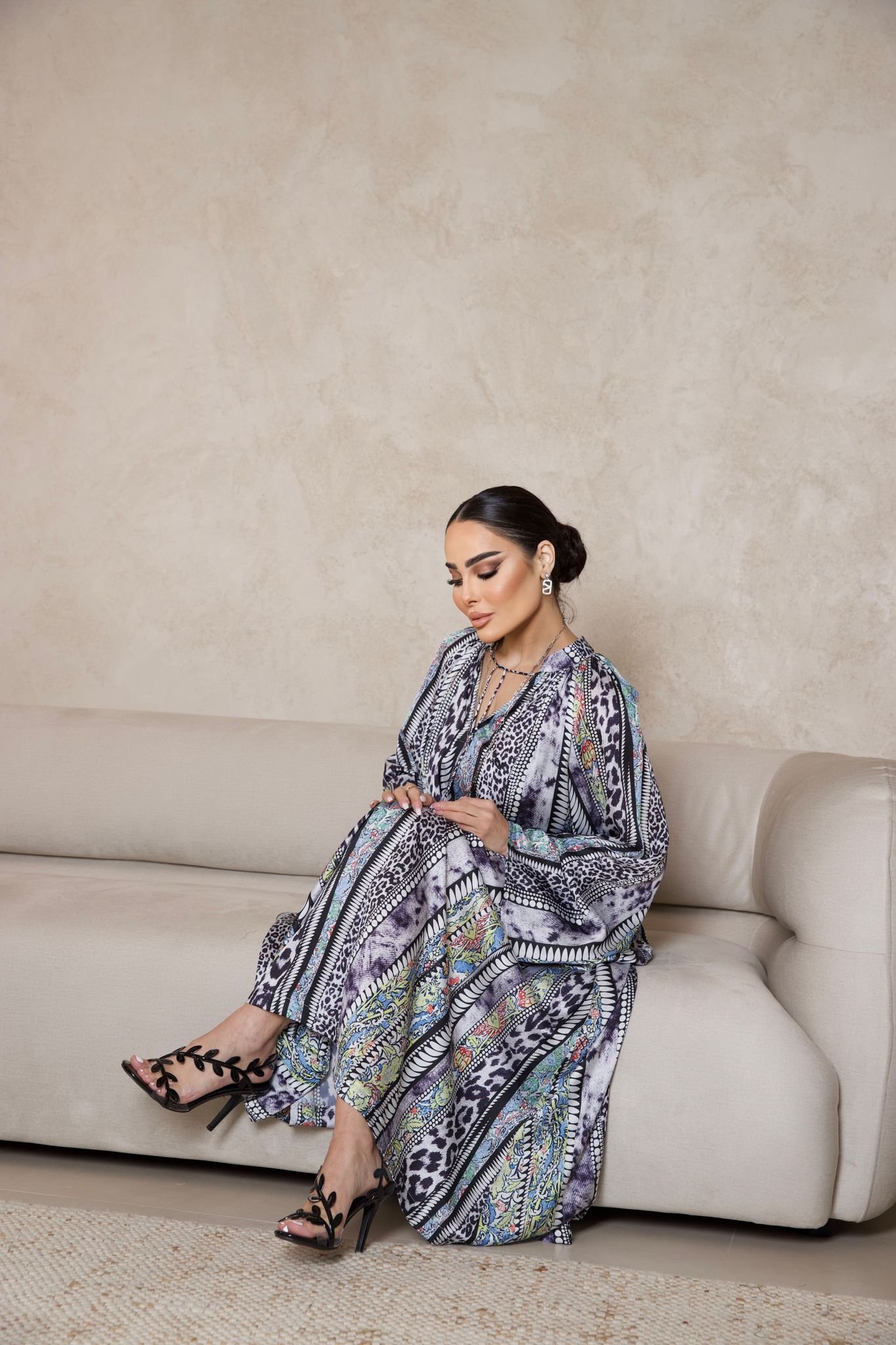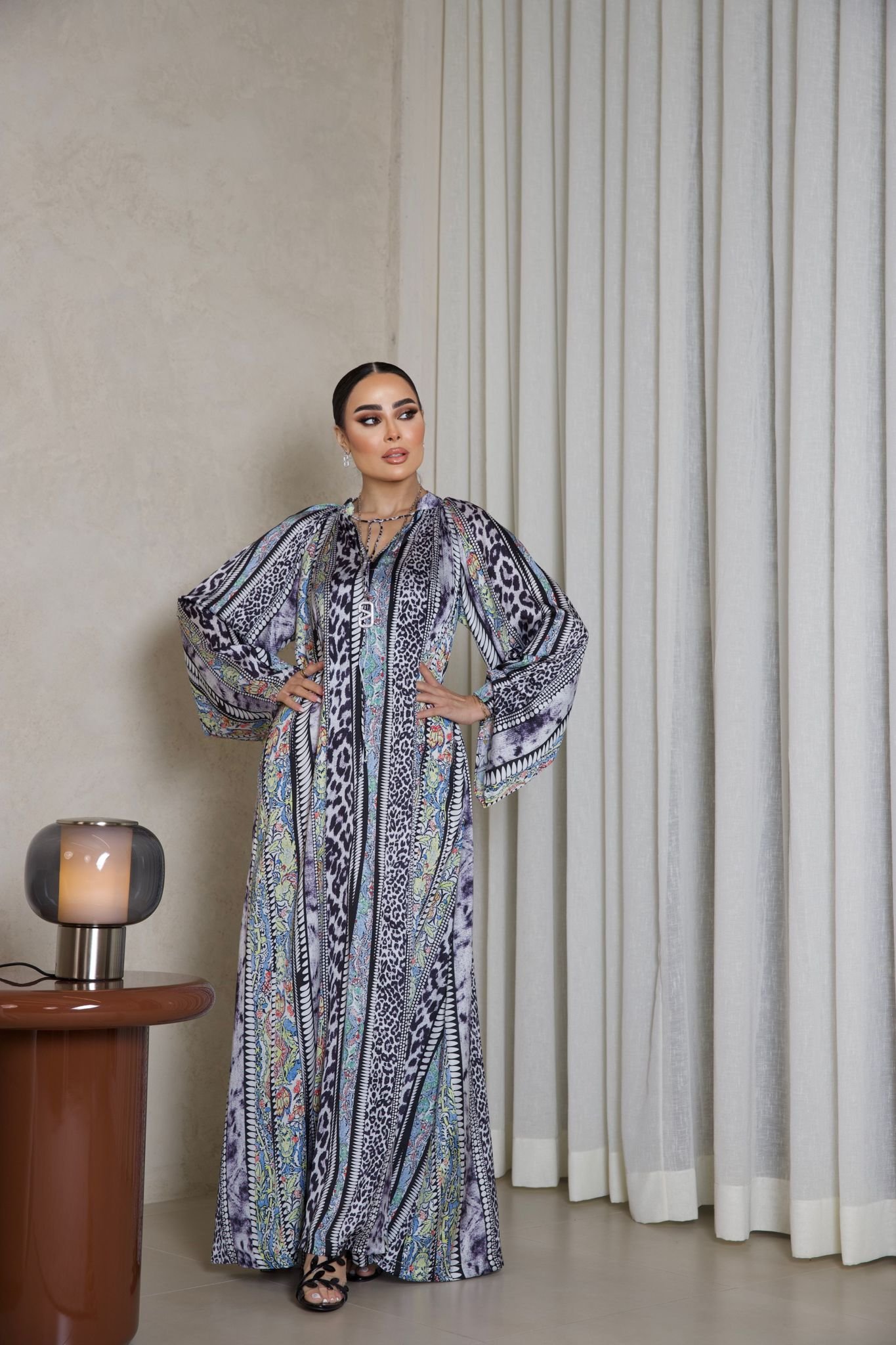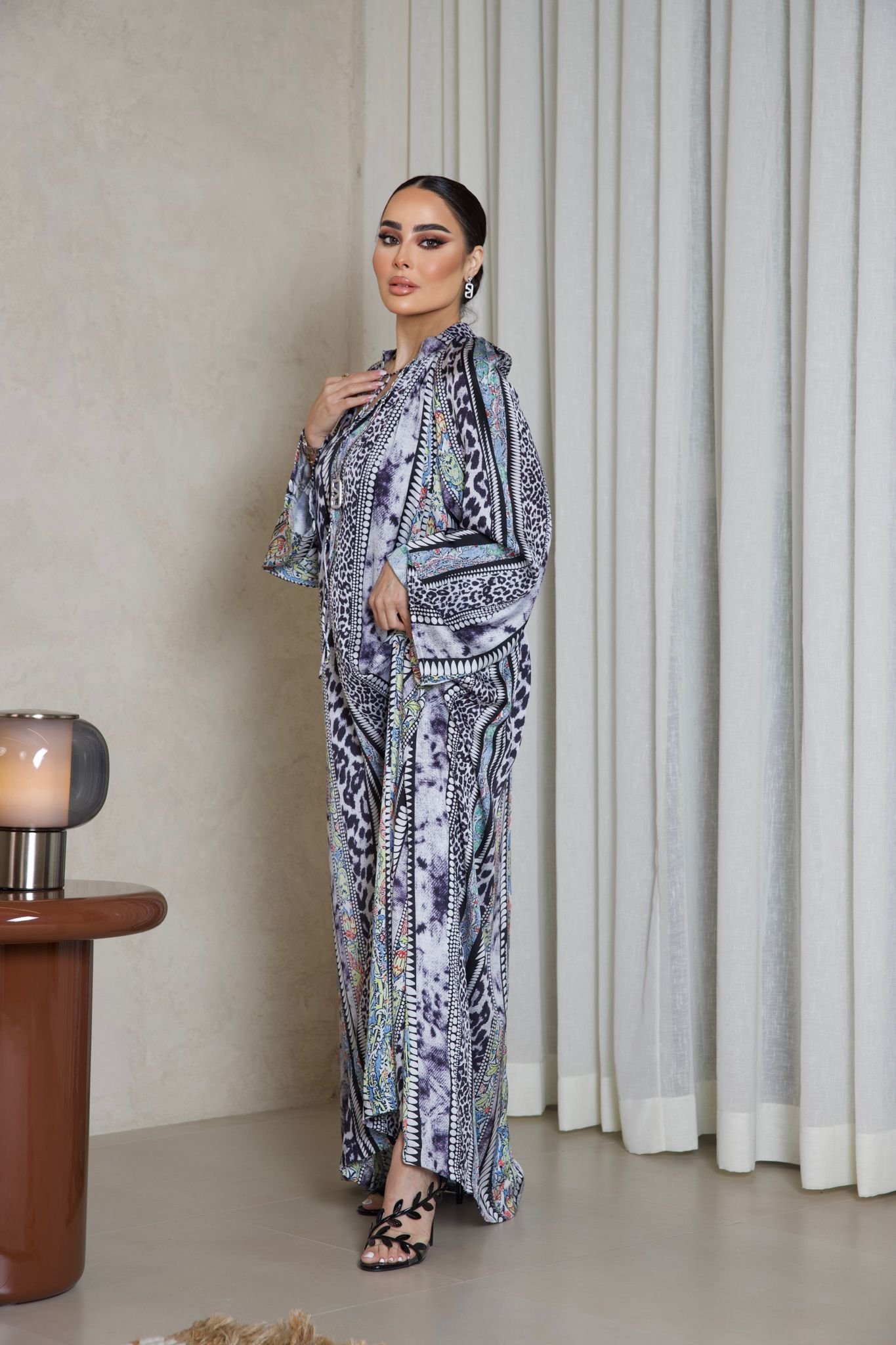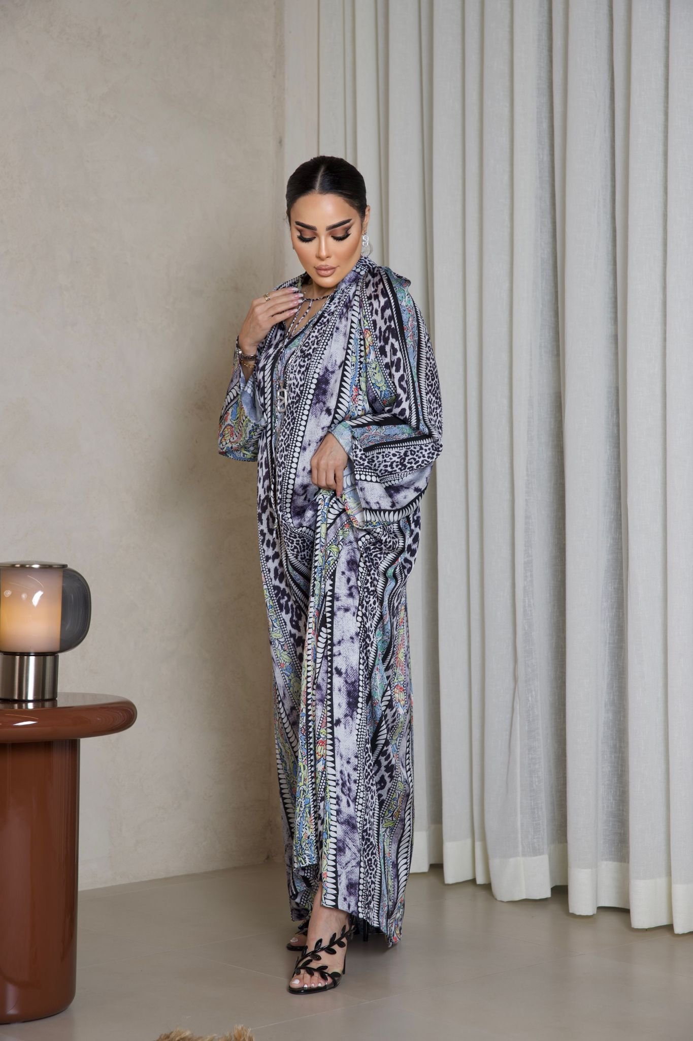 دراعة حريرية فاخرة بطبعات ملونة غنية ونقوش انسيابية، بتصميم فضفاض وأكمام واسعة تمنح إطلالة راقية وعصرية