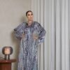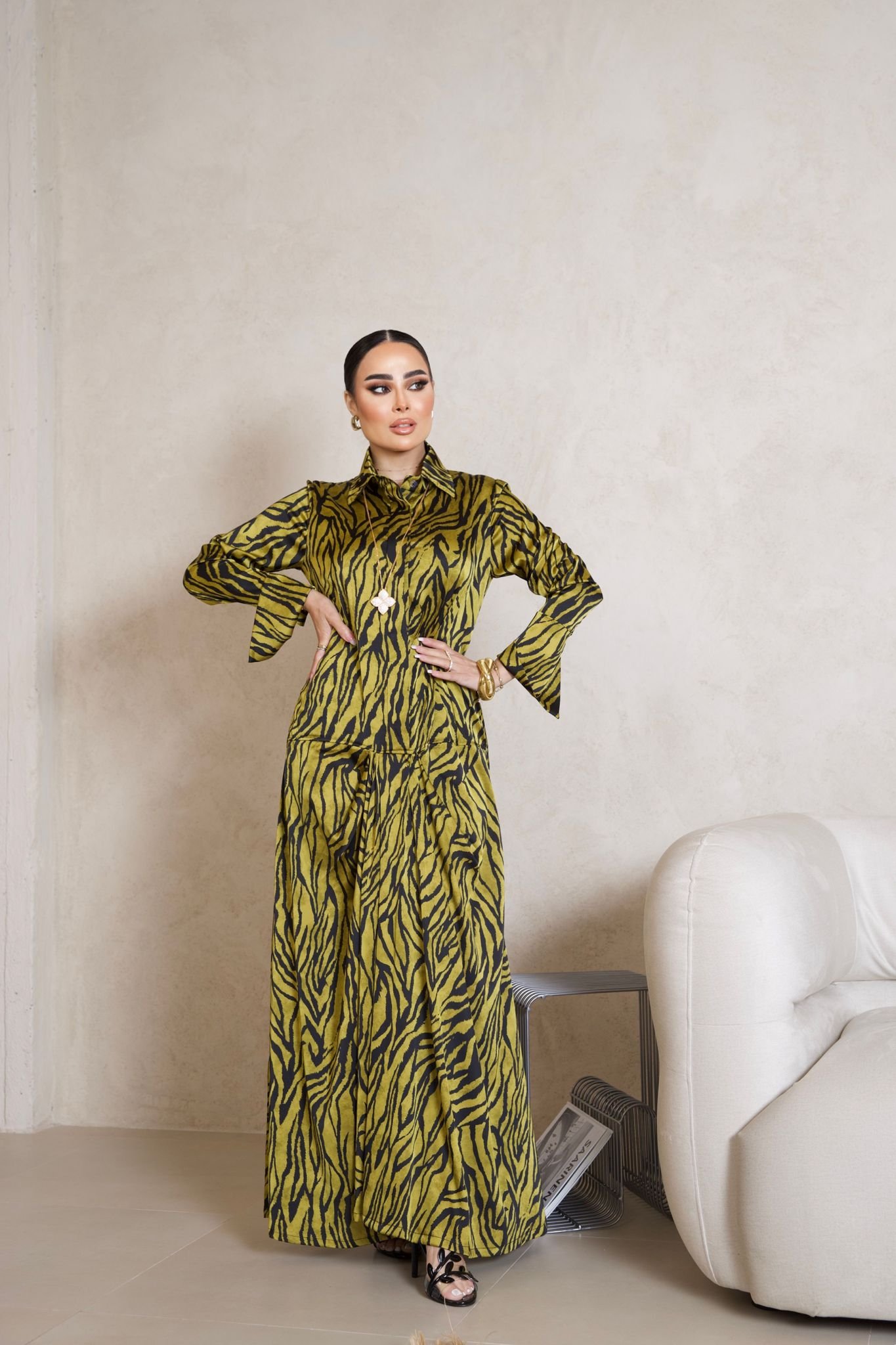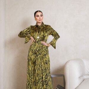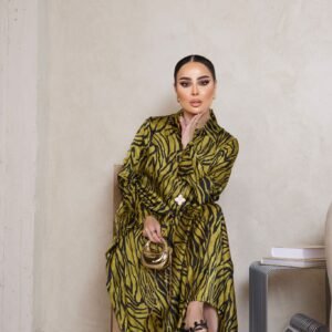 بدلة استقبال قطعة واحدة من حرير فاخر بنقشة زِبرة باللون الزيتوني والأسود، بتصميم عصري وياقة كلاسيكية لأناقة ملفتة